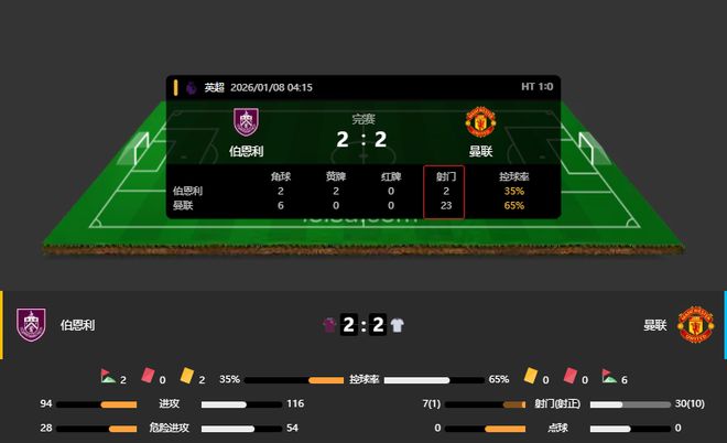 第59分钟,曼联左路快速反击,多古插上禁区边上兜传门前,谢什科小禁区前沿抢点凌空抽射,皮球击地后弹入球门左下死角,谢什科梅开二度,曼联2:1反超了比分。曼联前场好不容易反超了比分,没想到仅仅6分钟后他们的后防又没有顶住,伯恩利右路进攻,爱德华兹禁区直塞,安东尼禁区前沿接球,曼联3,4个人竟然都没有防住,安东尼人群中闪出空当左脚大力兜射,皮球直挂球门右上死角,伯恩利2:2扳平比分。伯恩利全场就2次射门,结果曼联就被打入2球。第84分钟,曼联倒还是又绝杀的机会,只不过运气没有站在他们这边,替补登场的小将莱西带球推进到禁区前沿,横切闪出空当左脚大力兜射,BOOM的一声皮球被横梁挡出。最终曼联全场射门23:2的情况下,爆冷被伯恩利2:2逼平。