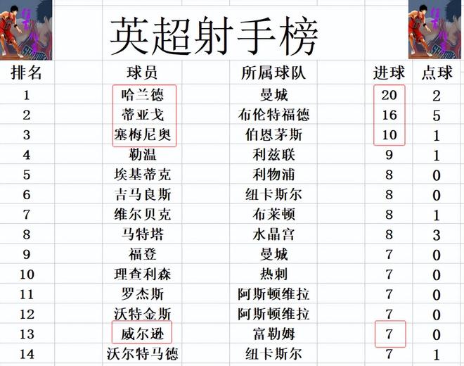 射手榜方面,哈兰德点射建功,成为赛季第1个进球上20的球员,继续稳居榜首,蒂亚戈梅开二度,继续缩小和哈兰德的差距,4球之差还是排在第2。塞梅尼奥在去曼城之前继续进球,成为第3个进球上双的球员。勒温9球独居第4,威尔逊追上福登等人7球刚好挤入前十。